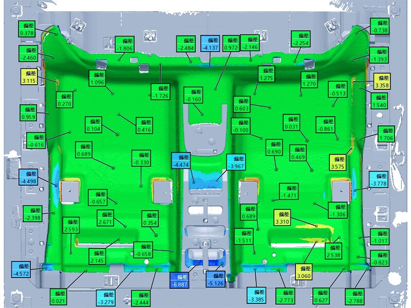 配合專業掃描軟件,即時呈現直觀的3D掃描結果。將掃描獲取的數據與CAD模型對比,完成曲面分析檢測,通過3D軟體生成直觀的色譜偏差圖,精準定位問題區域,為後續產品二次開發提供數據指導,同時還可以為主機廠提供3D數位化的檢測報告。