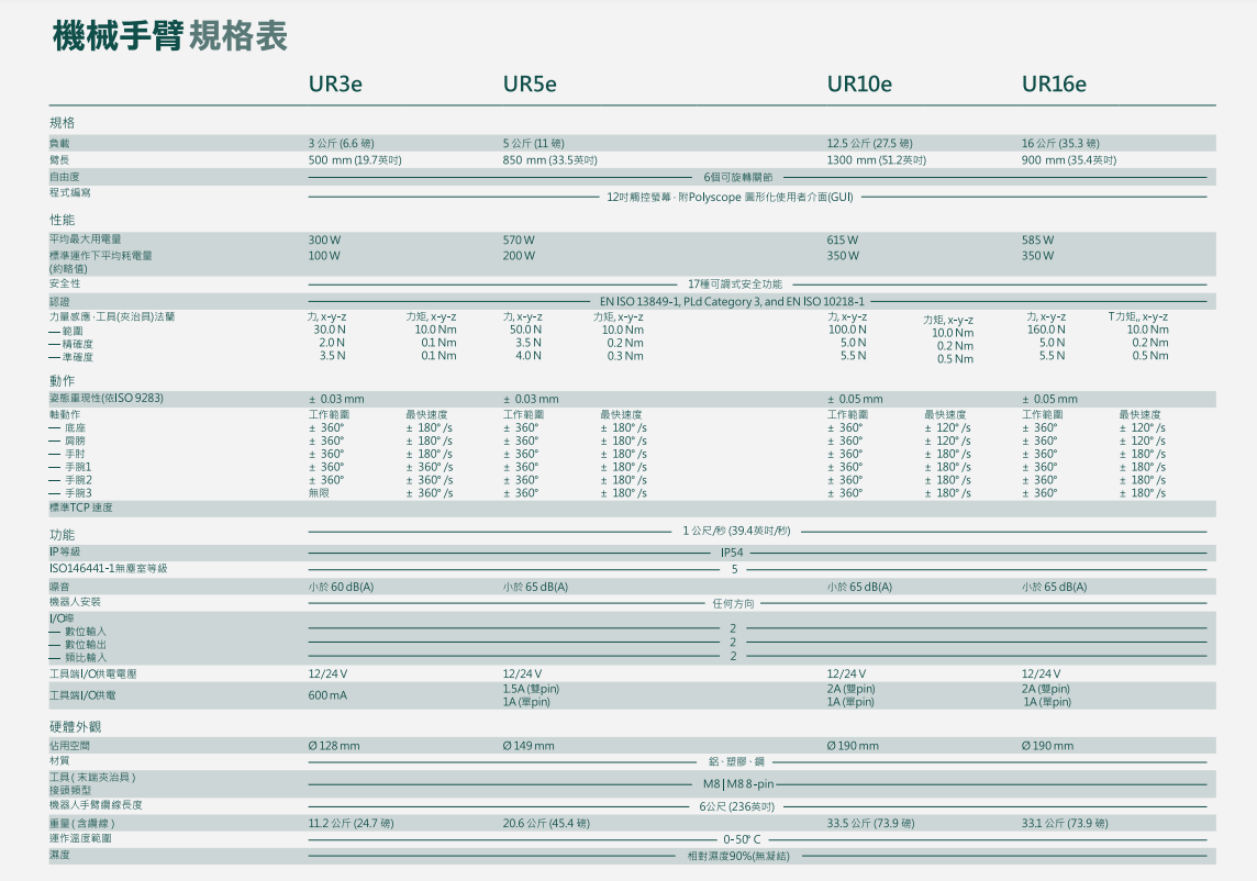 UR協作型機器人全系列有五大機種,提供3、5、12.5、16及20公斤負載選擇。
