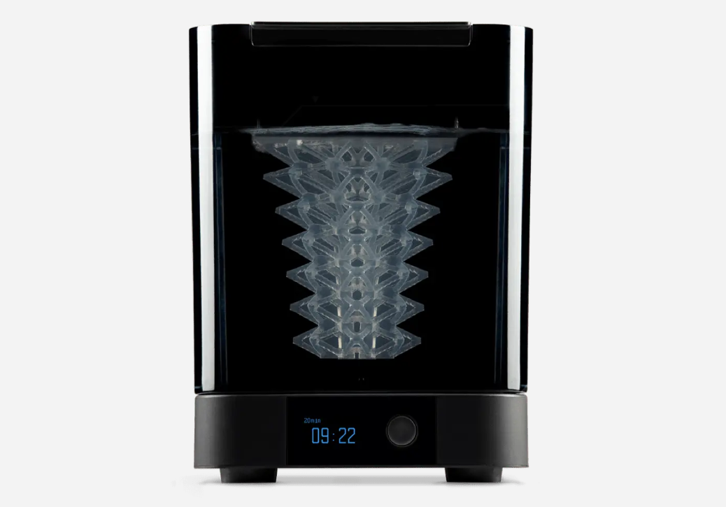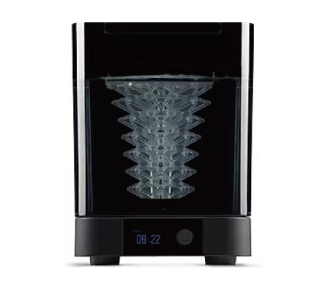 透過螺旋槳攪拌罐中的 IPA,以確保模型上殘留的任何樹脂都被沖走。可提前設定清洗時間,清洗後自動烘乾。
