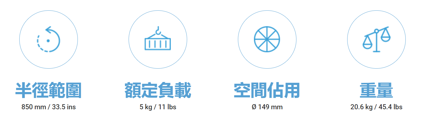 UR5e 靈活機器人理想用於優化低重量協作過程,例如取放料和測試。 UR5e 協作機器人工作半徑 33.5 英寸(850mm),可以自動化完成任何任務,讓員工有時間為其他生產流程創造更多價值。