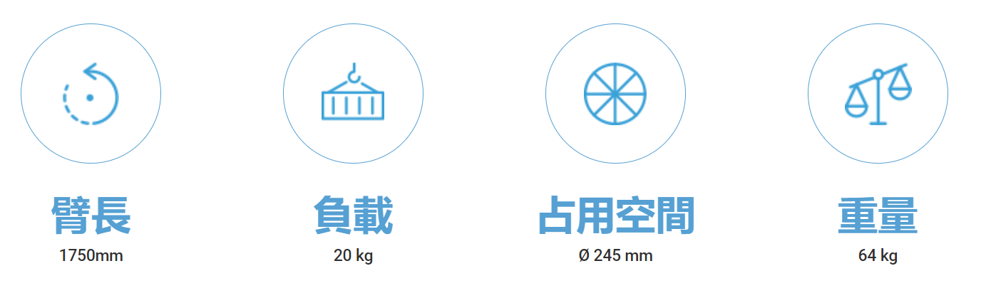 - UR20占地面積小,因此用戶處理零件取放範圍較大的應用時,可在同一工站內安裝多台機器人。除了全新關節結構提高動作一致性外,1,750公釐的臂長亦有效延伸整體工作範圍。